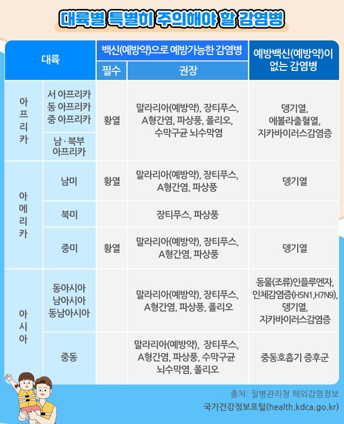 해외여행을 계획 중이라면 방문지역의 풍토병이나 감염병 정보와 권장되는 예방접종 여부를 먼저 확인할 것을 권장합니다. 예방접종이 필요한 경우에는 출국하기 최소 2주 전에는 접종을 받아야 하므로 미리 점검하는 것이 좋습니다. 동남아시아와 같이 모기가 매개하는 감염병이 유행하는 지역으로 여행을 계획한다면 모기 기피제, 모기장, 모기향과 함께 밝은 색 긴소매 옷과 긴 바지를 준비하여 모기에 물리지 않도록 대비합니다. 또한, 여행지 날씨를 미리 확인하여 적절한 옷을 준비합니다.