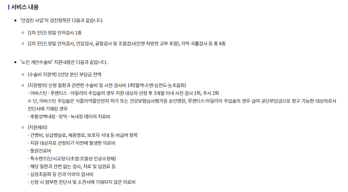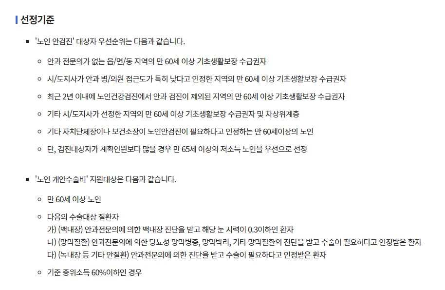 - (노인 안검진) 만 60세 이상의 노인을 대상으로 하되, 저소득층을 우선 지원합니다.