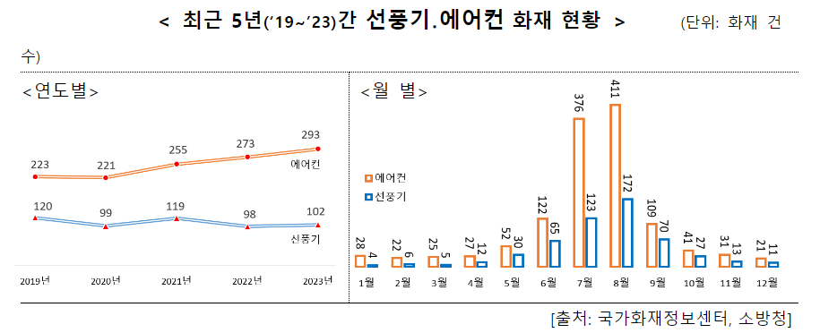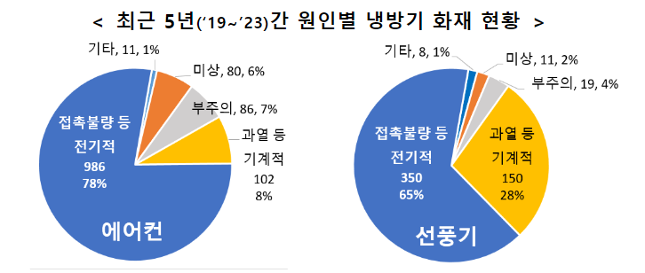 이 중 에어컨 관련 화재는 1,265건, 선풍기는 538건으로 에어컨으로 인한 화재가 2.4배 정도 많고 해다가
