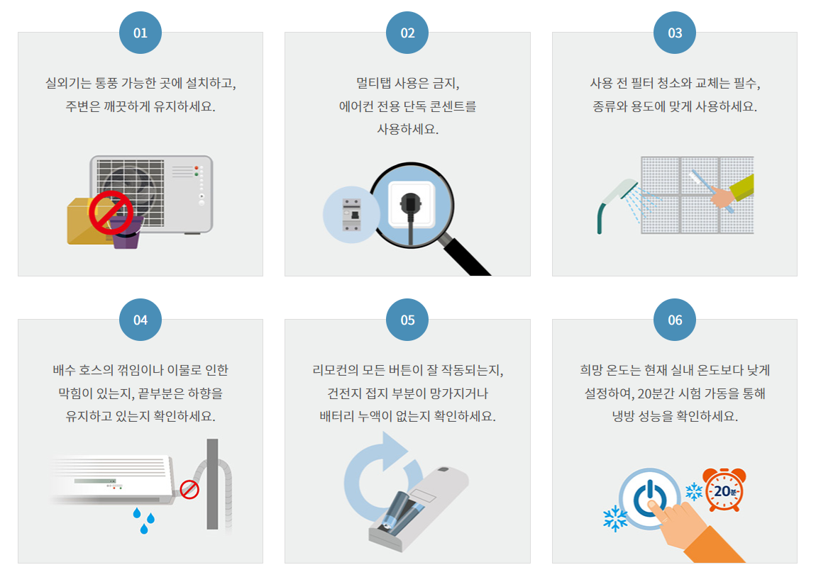 - 실외기는 통풍 가능한 곳에 설치하고, 주변은 깨끗하게 유지하세요