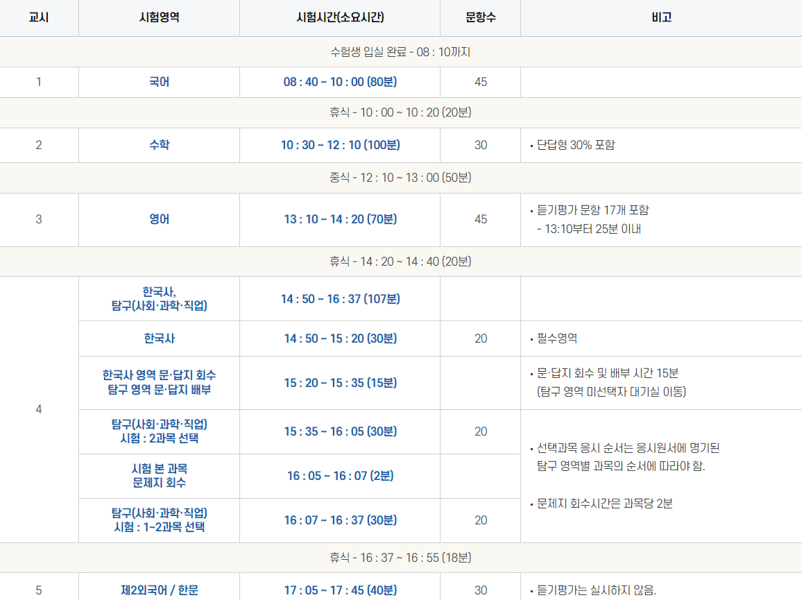 ※ 4교시는 한국사 영역 시험 이후, 탐구 영역 시험이 진행됨. 한국사 영역 시험시간은 30분이며, 한국사 영역 종료 후 15분의 문답지 회수 및 탐구 영역 미선택자 대기실 이동 시간을 둠